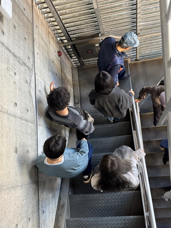 非常階段を使って建物の外に出るという、避難訓練を実施しました。