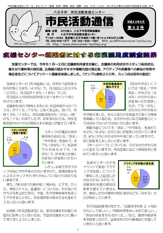 5月1日付けで「市民活動通信第42号」を発行いたしました。 第3面には、新年度にあたり当支援センター長からの挨拶と新しいスタッフの紹介なども掲載しています。 巻頭には今年初めに行いました「市民満足度調査」の結果を載せています。 他にもいつもの市民活動団体のイベント情報のほかに、「市民活動通信」は市民センターや市内の駅の広報スタンドなどではいふしておりますので、ぜひ手にとってご覧下さい。