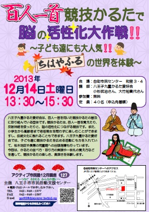 今回は、かるたの並べ方・取り方の実践や一枚札の覚え方などを通して、競技かるたの楽しさ、奥深さを体験します。
