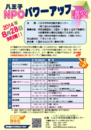 少子高齢化などさまざまな問題が山積している状況の中、協働や共助の担い手としてのNPOへの期待が高まっています。八王子市市民活動支援センターでは、NPO・市民活動団体が、地域の担い手として、より一層充実した活動ができるよう、団体運営の実務を系統的に学べるパワーアップ講座を開催します。