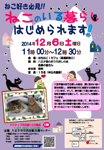 八王子猫のおうち探しの会は、飼い主のいない猫を保護し、飼育希望の方に譲渡する活動を行っています。そして、落ち着いて猫と触れ合い、相性を確認する場として、ねこカフェを運営しています。今回は、会の活動の紹介を通して、飼い主のいない猫たちの実態や猫の飼い方のコツなど猫にまつわるエトセトラをお話しします。