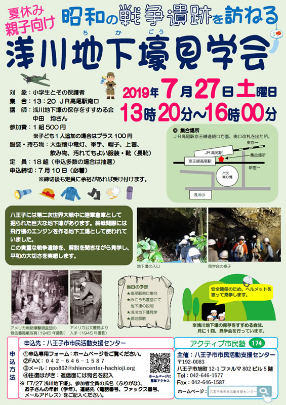 お申込みの際には、申込講座名「7/27浅川地下壕」、参加者全員の氏名(ふりがな)、お子さんの年齢(学年)、連絡先(電話番号・FAX・メールアドレス)をお知らせください。