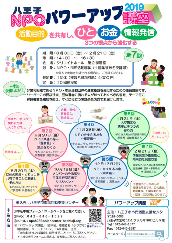 ※「パワーアップ講座」、団体名、連絡者名(ふりがな)、電話番号、メールアドレス、FAX番号、住所、「参加動機または期待すること」をお知らせください。