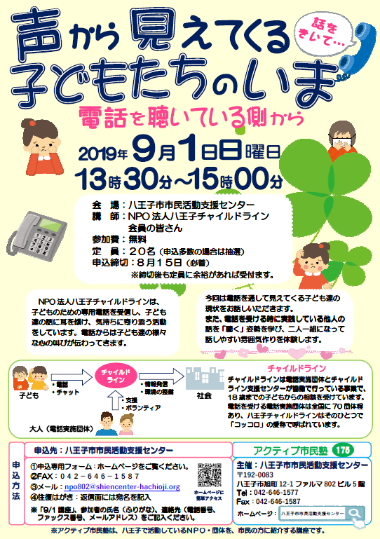 NPO法人八王子チャイルドラインは、子どものための専用電話を受信し、子ども達の話に耳を傾け、気持ちに寄り添う活動をしています。電話からは子ども達の様々な心の叫びが伝わってきます。