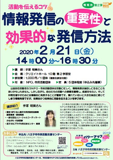 公益的な活動を行うNPO・市民活動団体は活動に忙しく、情報発信は後回しになることも多いかもしれません。しかしながら、自分たちの活動への信頼を獲得し、応援をもらい、そして仲間を増やすためには積極的に発信することが重要です。慣れていないと大きな負担に感じてしまう情報発信ですが、効果的かつ効率的に活動を伝えるコツを学びます。