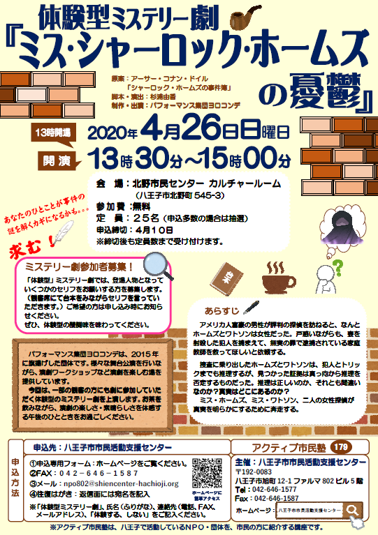 お申込みの際には、申込講座名「体験型ミステリー劇」、氏名、連絡先(電話番号・FAX・メールアドレス)、「体験する しない」をお知らせださい。