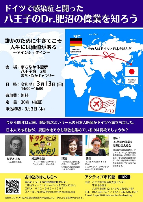 「Dr.肥沼の偉業を後世に伝える会」の皆様を講師に迎え、Dr.肥沼の功績と、会が成し遂げたドイツ ヴリーツェン市との友好交流協定締結などについて紹介していただく講座を開きます。