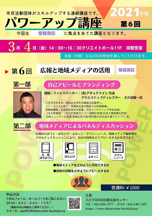 お申込みの際、「パワーアップ講座第6回」・受講スタイル(対面又はZOOM)・受講希望講座を明記のうえ、団体名・参加される方の氏名(ふりがな)・連絡先(TEL・メールアドレス)をお知らせください。