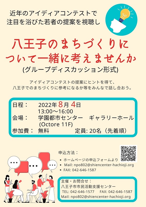 FAX又はメールの場合、件名に8月4日グループディスカッションをご記入の上、氏名(ふりがな)・電話番号・メールアドレスをお知らせください。