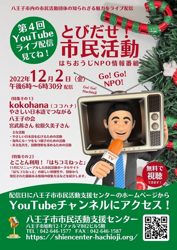 YouTubeライブを使い、八王子市内の市民活動を市民へ伝える情報番組です。