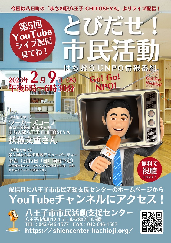 2023年2月9日(木)午後6時~6時30分 《特集その1》 ワーカーズコープ東京三多摩山梨事業本部 まちの駅八王子 CHITOSEYA 扶蘓文重さん 《特集その2》 第2回みんなの地域デビューパーティー 予告(3月5日(日)開催予定)、学園都市センターにたくさんの団体が出展・参加する大イベントを紹介します。 視聴方法 2月9日に以下の八王子市市民活動支援センターYouTubeチャンネルへアクセスしてください。