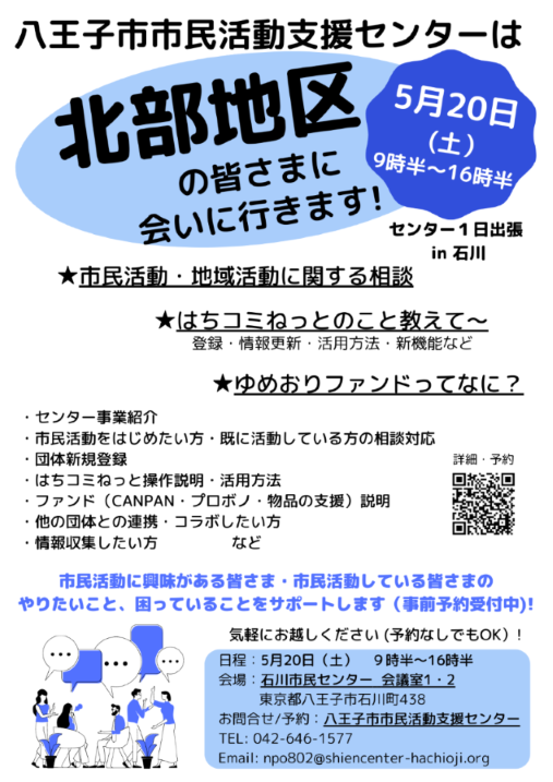 八王子市市民活動支援センターは、昨年度から市民活動のより一層の広がる目的として、中央地区以外でセンター1日出張を実施しています。
