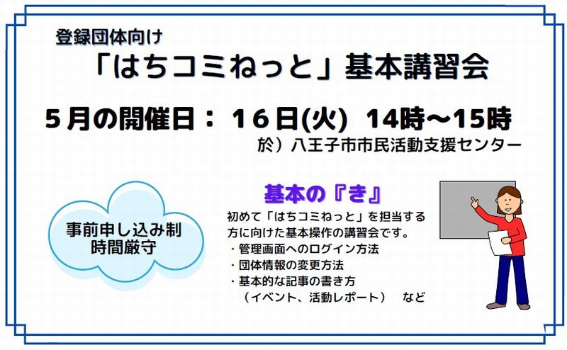 ◆◇◆こちらの講習会は事前にお申し込みをお願いします◆◇◆ 初めて「はちコミねっと」を担当する方に向けた基本操作の講習会です。 ・管理画面へのログイン方法 ・団体情報の変更方法 ・基本的な記事の書き方(イベント・講座、活動レポート) 開催日: 2023年05月16日(火) 開催時間: 14:00~15:00 開催場所: 八王子市市民活動支援センター