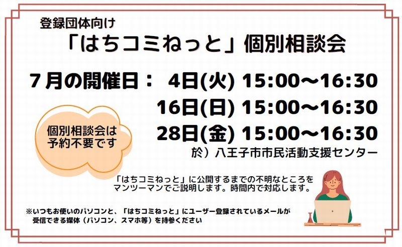 「はちコミねっと」に記事を公開する際に、ご不明なところをマンツーマンでご説明します。 事前の予約は不要です。時間内にお越しください。 開催日: 2023年7月4日(火)、16日(日)、28日(金) 開催時間: 15:00~16:30 開催場所: 八王子市市民活動支援センター ※いつもお使いのパソコン、「はちコミねっと」にユーザー登録されているメールが 受信できる媒体(パソコン、スマホ等)をご持参ください。