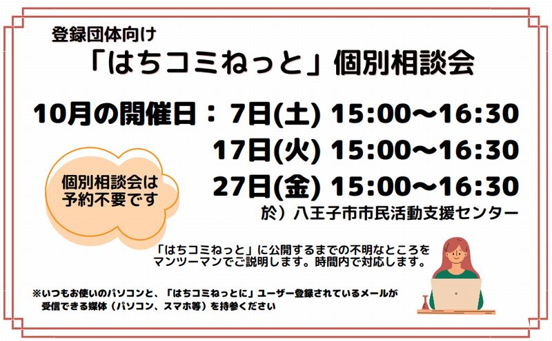 「はちコミねっと」に記事を公開する際に、ご不明なところをマンツーマンでご説明します。 事前の予約は不要です。時間内にお越しください。 開催日: 2023年10月7日(土)、17日(火)、27日(金) 開催時間: 15:00~16:30 開催場所: 八王子市市民活動支援センター ※いつもお使いのパソコン、「はちコミねっと」にユーザー登録されているメールが 受信できる媒体(パソコン、スマホ等)をご持参ください。