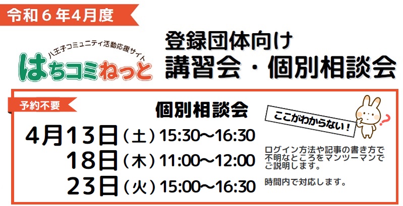ログイン方法や記事の書き方で不明なところをマンツーマンでご説明します。 事前の予約は不要です。時間内にお越しください。 開催日時: 2024年 4月13日(土)15:30~16:30 4月18日(木)11:00~12:00 4月23日(火)15:00~16:30 開催場所: 八王子市市民活動支援センター ※いつもお使いのパソコン、「はちコミねっと」にユーザー登録されているメールが 受信できる媒体(パソコン、スマホ等)をご持参ください。