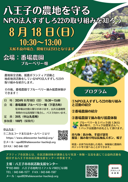 今回のアクティブ市民塾では、八王子の農地の現状とNPO法人すずしろ22の取り組みの活動紹介、番場農園の紹介と番場農園でブルーベリー摘み取り援農体験を予定しています。