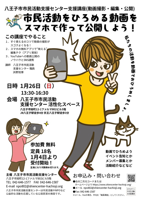 地域活動団体・NPO団体、市民活動団体の、講座やイベントの紹介、メンバー募集、活動紹介等、活動のさらなるひろがりのために、お持ちのスマートフォンを使って、動画を撮影・編集し、公開する方法を学びます。