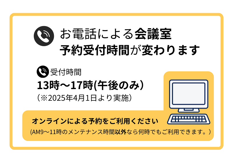 令和7年4月1日より、電話による当センター会議室ご予約受付時間が変わります。
