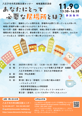 色々な形・空間・機能などを持つ居場所。地域に存在する色々な居場所を確認し、情報共有と意見交換を通して、参加者のみなさまにとって「居場所」とは何か、現代社会のニーズに応える「居場所」について一緒に考えてみませんか。