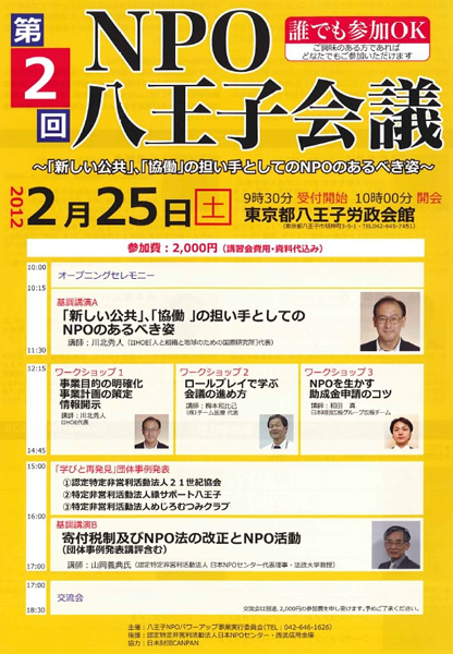 しかし、一方でこのことは、NPO団体自体の信頼性や透明性、健全性など資質の向上が明確な形で求められているということでもあります。第2回NPO八王子会議を開催するに当たり、各関係団体が、これを資質向上のきっかけとし、法改正のメリットを充分に活かされることを願っています。