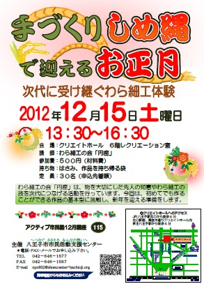 わら細工の会「円座」は、物を大切にした先人の知恵やわら細工の技を次代につなげる活動を行っています。今回は、初めてでも作ることができる作品の基本型に挑戦し、新年を迎える準備をします。