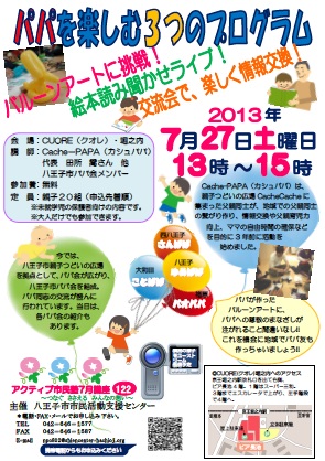 Cache-PAPA(カシュパパ)は、親子つどいの広場CacheCacheに集まった父親同士が、地域での父親同士の繋がり作り、情報交換や父親育児力向上、ママの自由時間の確保などを目的に3年前に活動を始めました。今では、八王子市親子つどいの広場を拠点として、パパ会が広がり、八王子市パパ会を結成。パパ同志の交流が盛んに行われています。当日は、各パパ会の紹介もあります。パパが作ったバルーンアートに、パパへの尊敬のまなざしが注がれること間違いなし!!これを機会に地域でパパ友も作っちゃいましょう!!講座の様子はユーストリームにて配信予定です。