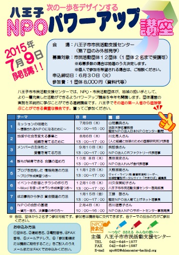 八王子市市民活動支援センターでは、NPO・市民活動団体が、地域の担い手として、より一層充実した活動ができるようパワーアップ講座を今年も開講します。団体運営の実務を系統的に学ぶことができる連続講座です。八王子でその道の第一人者から直接学ぶことができる貴重な機会です。奮ってご参加ください。