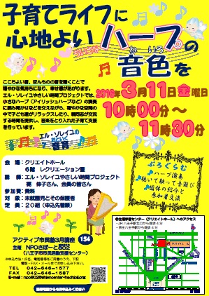 エル・ソレイユやさしい時間プロジェクトでは、小さなハープ(アイリッシュハープなど)の演奏に読み聞かせなどを交えながら、穏やかな空間の中で子ども達がリラックスしたり、親同志が交流する時間を提供し、音楽をとり入れた子育て支援を行っています。