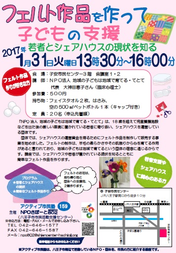 団体では、シェアハウスの運営資金を得るためにフェルト作品を制作して販売する事業を始めました。フェルトの制作は、羊毛の柔らかさやその肌触りから心を育てる作用があると言われており、地域の子どもは地域で育てるという団体の理念に通じるからです。講座では、シェアハウスや若者が置かれている現状を知るとともに