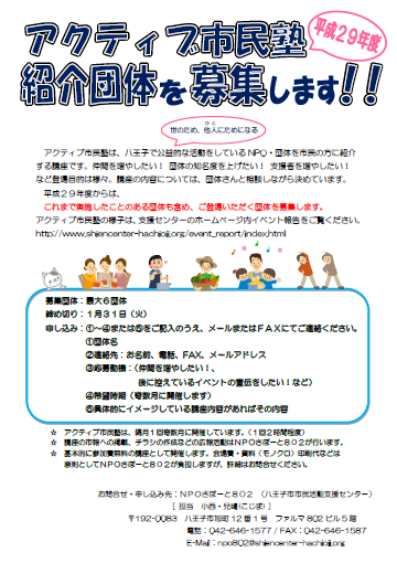 お問合せ・申し込み先:NPOさぽーと802 (八王子市市民活動支援センター)