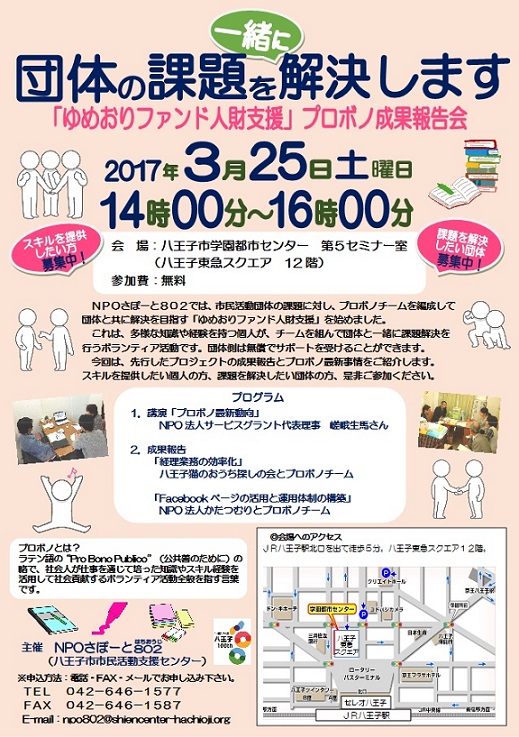 NPOさぽーと802では、市民活動団体の課題に対し、プロボノチームを編成して団体と共に解決を目指す「ゆめおりファンド人財支援」を始めました。