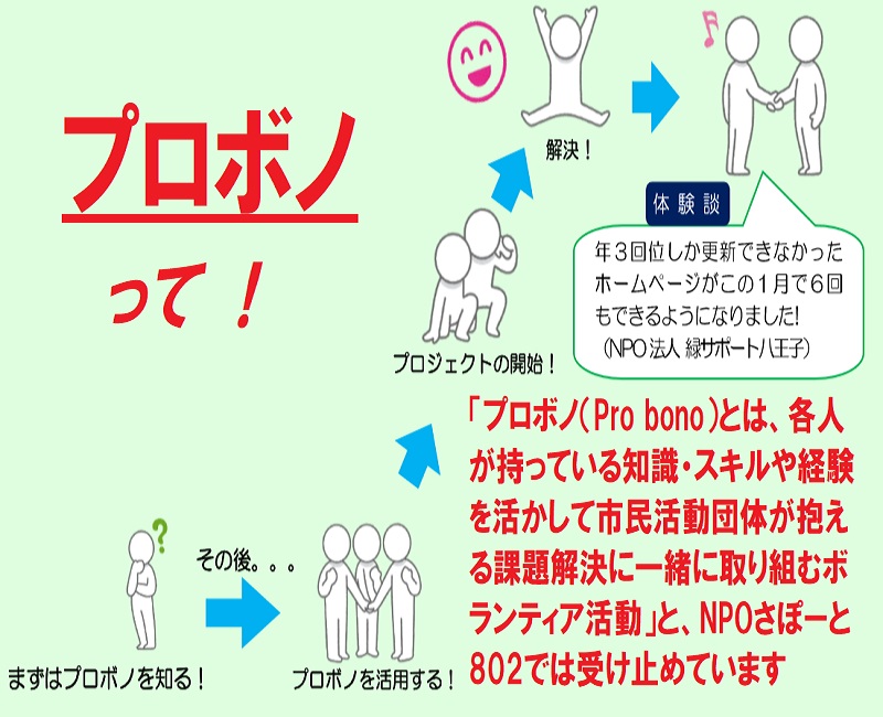 市民活動支援センターでは、仕事で培った知識やスキル・経験を持ったボランティア(プロボノワーカー)が、団体の困りごとを一緒に解決する取り組み(プロボノ)を始めました。ホームページの改修や団体の会計処理の仕組み作りなど、新たに取り組みたい団体の皆様、スキル・経験を持った助っ人と一緒に取り組むことができるプロボノをご活用ください。