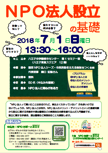 ※「7/1 NPO設立講座」、氏名(ふりがな)、電話番号をお知らせください。