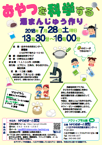今回は、酒まんじゅうを作りながら、コウジカビを顕微鏡で観察したり、キウイ・ゼリーの実験をしたりと、科学的な見方を加えたおやつ作りを体験します。