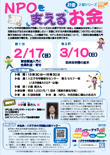 NPOや市民活動団体が活動していくために必要不可欠な「お金」。活動資金を安定して得たい!活動を広げるための資金を調達したい!活動に対する共感を資金調達につなげたいなどお金に関する悩みはつきません。この講座では、NPOを支えるお金について、1回目は資金調達入門と会員制度や寄付を、2回目は助成金申請の基本を学びます。