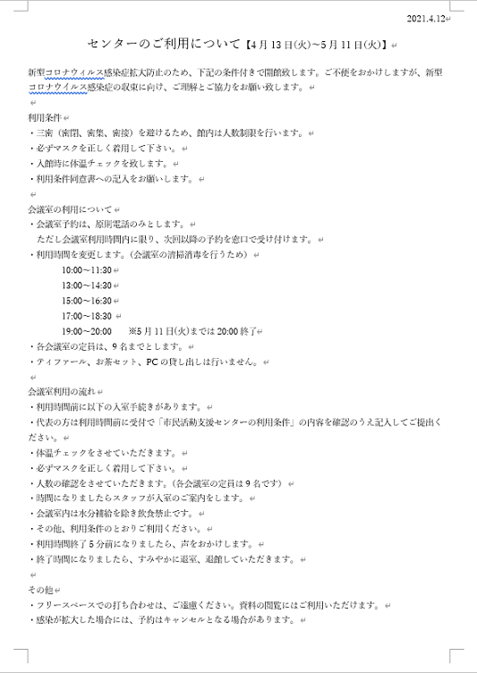 コロナ蔓延防止等重点措置に伴い、4月13日(火)から5月11日(火)まで会議室の19:00からの枠は20:00終了となります。