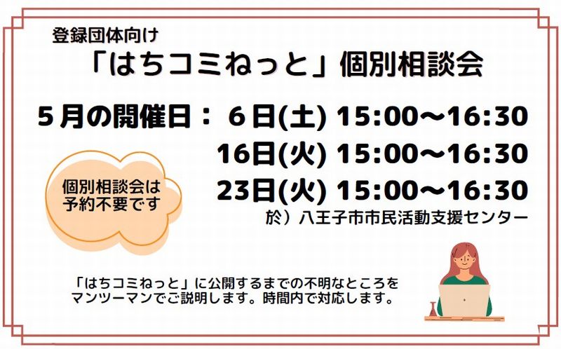 「はちコミねっと」に記事を公開する際に、ご不明なところをマンツーマンでご説明します。 事前の予約は不要です。時間内にお越しください。 開催日: 2023年05月6日(土)、16日(火)、23日(火) 開催時間: 15:00~16:30 開催場所: 八王子市市民活動支援センター