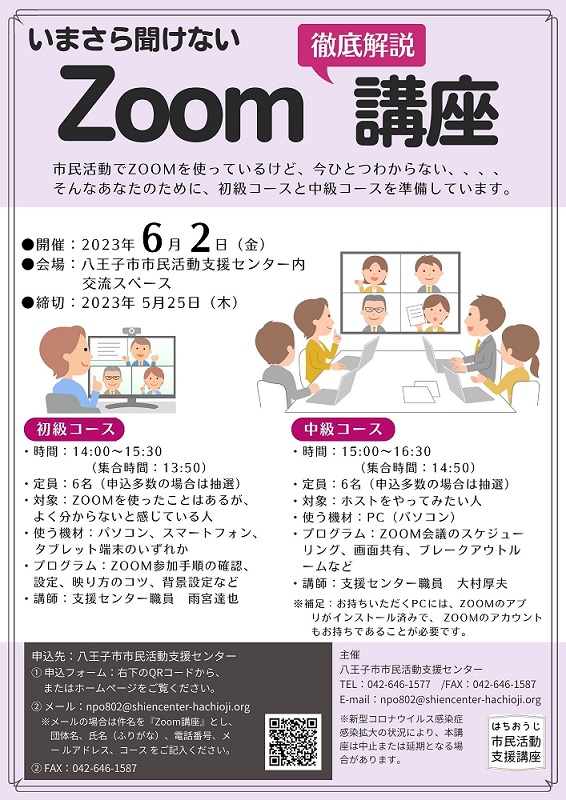 ※メールの場合は件名を『ZOOM講座』とし、団体名、氏名(ふりがな)、電話番号、