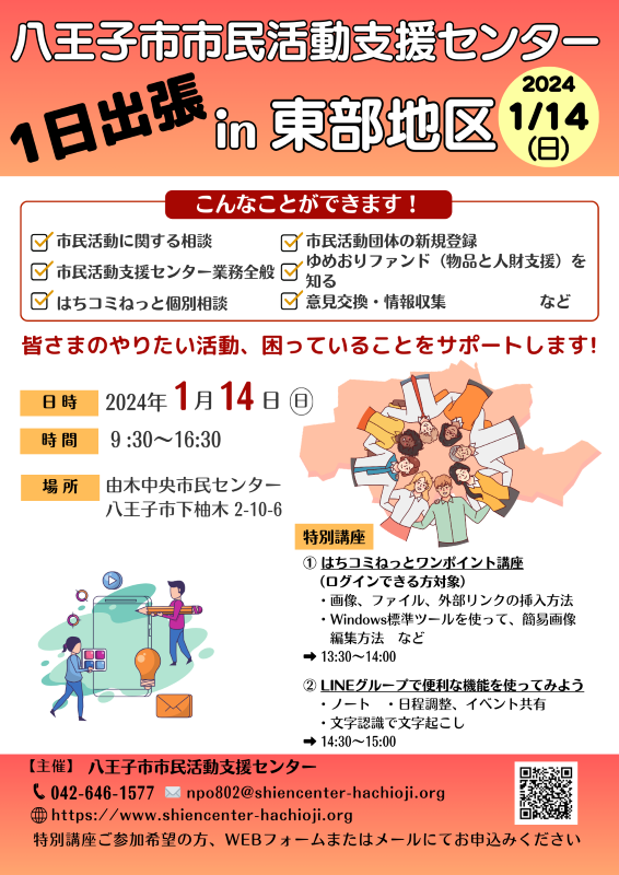 八王子市市民活動支援センターは、市民活動のより一層の広がる目的として、中央地区以外でセンター1日出張を実施しています。2024年1月14日は東部地区の皆さまに会いにいきます!