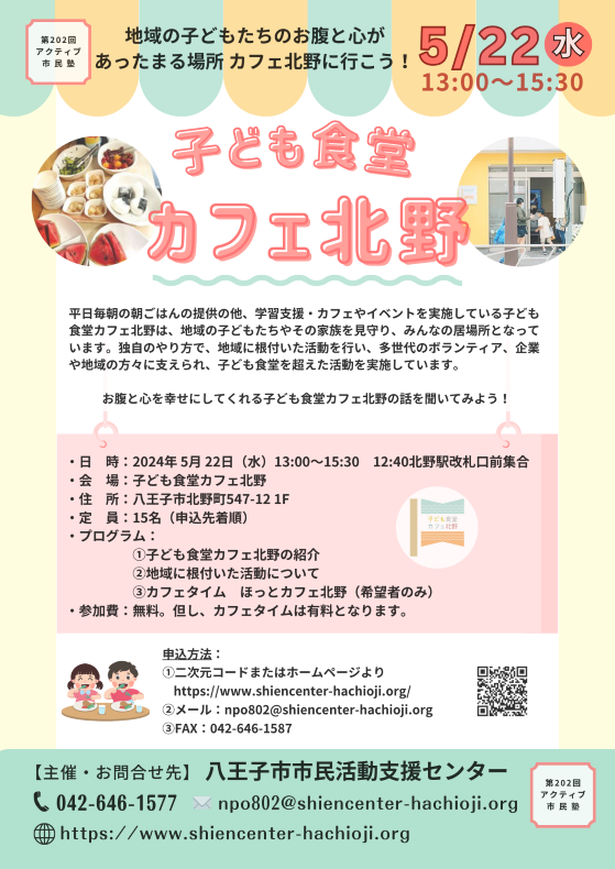 今回のアクティブ市民塾でお腹と心を幸せにしてくれる子ども食堂カフェ北野の話を聞いてみよう!