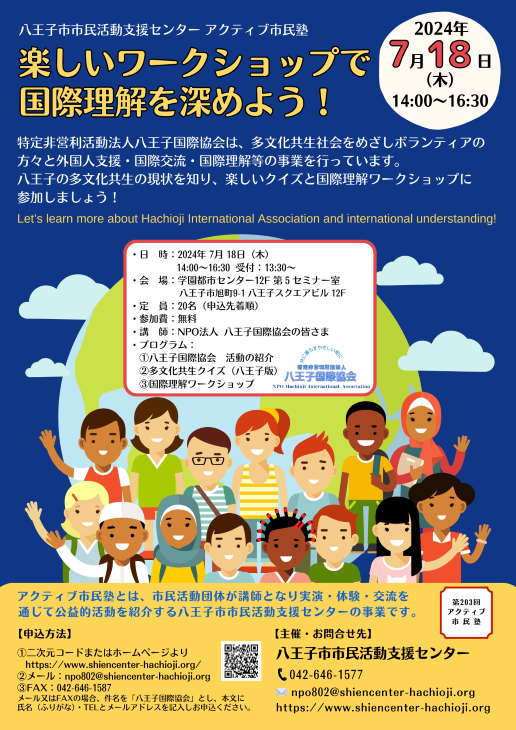 今回のアクティブ市民塾で、外国人支援・国際交流・国際理解等の事業を行っている特定非営利活動法人八王子国際協会の取り組みを知り、楽しいクイズとワークショップを通して、国際理解を深め、八王子の多文化共生について一緒に考えてみませんか。